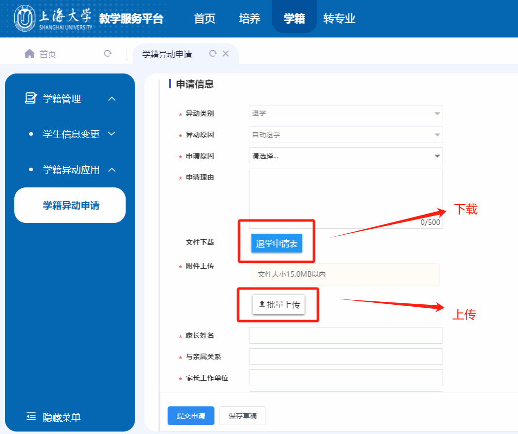 2. 进入异动申请信息填写界面,带*为必填项,据实填写。自动退学可点击【退学申请表】按钮下载申请表,系统会自动显示个人信息,核对个人信息(若有误可进行修改),并填写其他空白内容。学生和学生家长须认真填写,并手写签名。表格填写好后,用拍照等方式在附件上传处上传图片,确认无误后点击左下角【提交申请】按钮,提交异动数据进入到审核步骤,也可暂时【保存草稿】,确认信息无误后再进行提交。