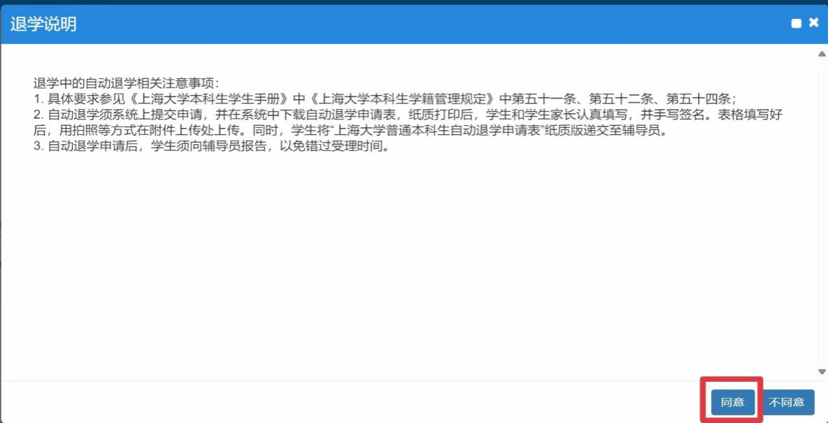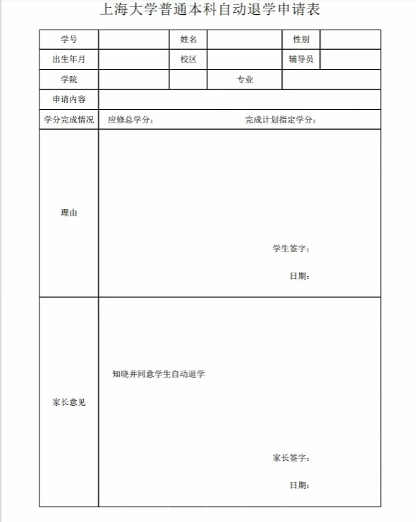 注:须上传学生本人和家长手写签名的《上海大学普通本科生自动退学申请表》。