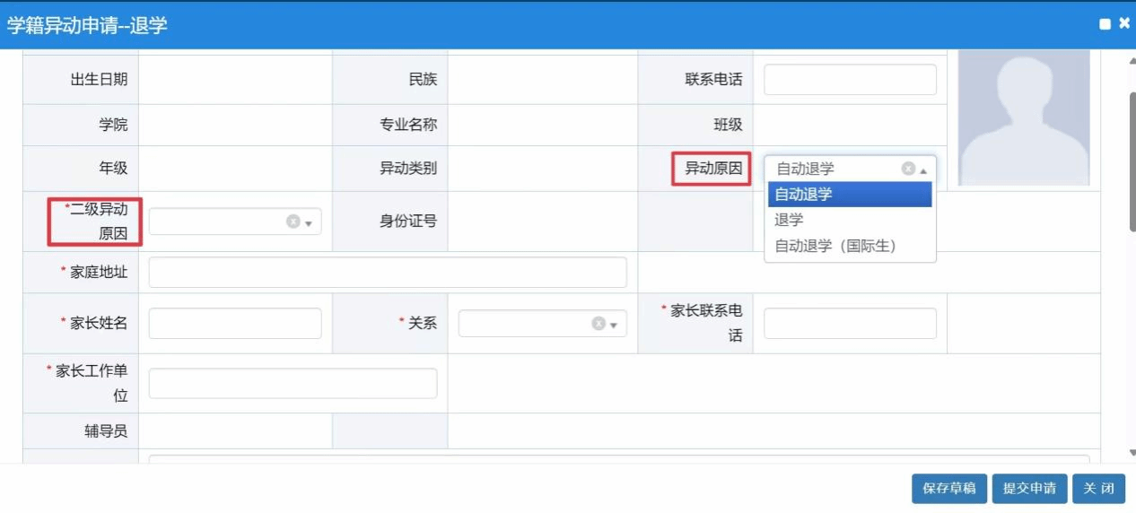 (3)申请页面中,请在【异动原因】中选择“自动退学”,并请在【二级异动原因】中选择相应原因;继续填写界面其它信息,带*为必填项。