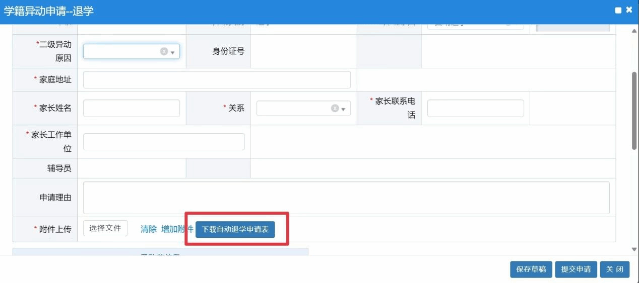在页面“附件上传”中下载“自动退学申请表”,填写好后再上传文件至附件。