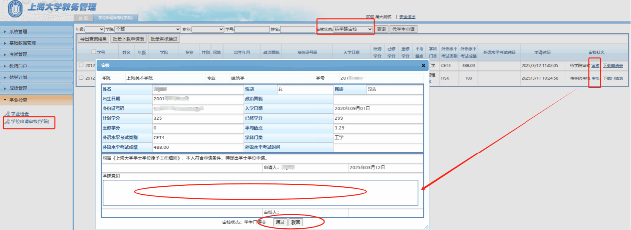 2.学院管理员可以在“上海大学教务管理”系统“学业检查”之“学位申请审核(学院)”页面审核自己管辖学院学生的学位申请;