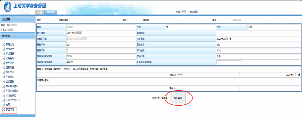3.学位申请者本人请于8月11日再次登陆教务系统https://cj.shu.edu.cn,查询学位申请资格审核结果。