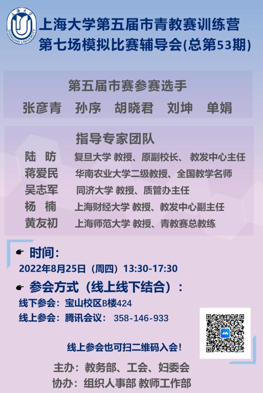 为了进一步落实学校本科教育大会精神,以一流师资队伍建设为目标深入提升教师教学能力,给青年教师提供同场竞技和风采展示的舞台,教务部教师教学发展中心将举办青年教师本科课堂教学竞赛市赛选手的校外专家专题辅导。